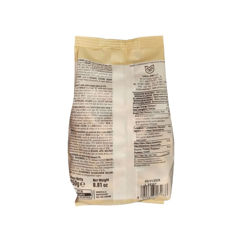 Ingredienti: Farina di GRANO tenero, vino bianco (contiene solfiti), olio di semi di girasole alto oleico, sale, olio extra vergine di oliva, preparato a base di formaggi di media maturazione in polvere(formaggio disidratato; siero di latte; proteine del siero di latte concentrate; grasso di latte; sali emulsionanti (E339, E331), sale), pepe nero